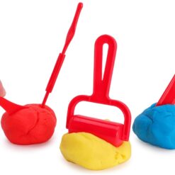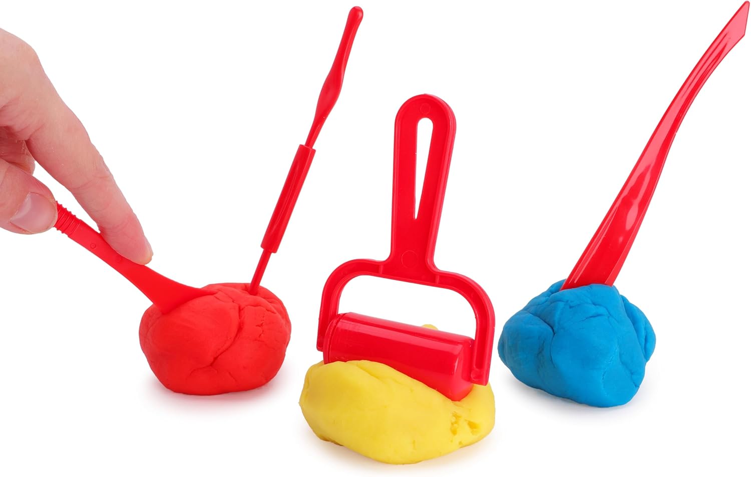 - Contents: 3 colourful play doughs with stamp lids, 3 cutters, 1 roller, shaped stamps, 1 wipeable play mat and 1 bucket.