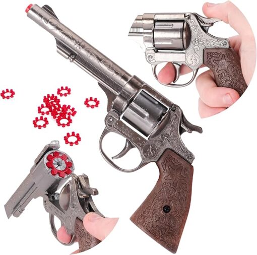 This pistol is highly decorated with intricate cowboy themed metal details, and is designed to encourage imaginable play and fun, This on-the-go toy is the perfect item for fun days at the park and beach.