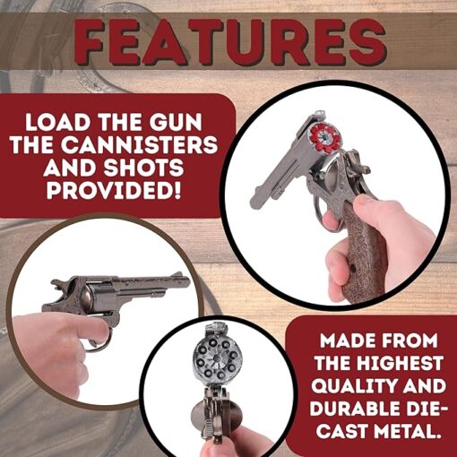 Step into the Wild West with this classic Die cast metal cowboy toy pistol. This product is fitted with an easy to load canister, load with a round of the caps provided, then aim and fire by pulling the trigger to create the smoke & sound effects. This pistol is highly decorated with intricate cowboy themed metal details, and is designed to encourage imaginable play and fun, This on-the-go toy is the perfect item for fun days at the park and beach. This toy pistol measures 21cm (9″) in size and is the ideal accessory to add to any cowboy themed fancy dress outfit. This product includes 12 reels of 8 shot caps (96 shots in total) and is made from the highest quality and durable die cast metal. Suitable for ages 3+