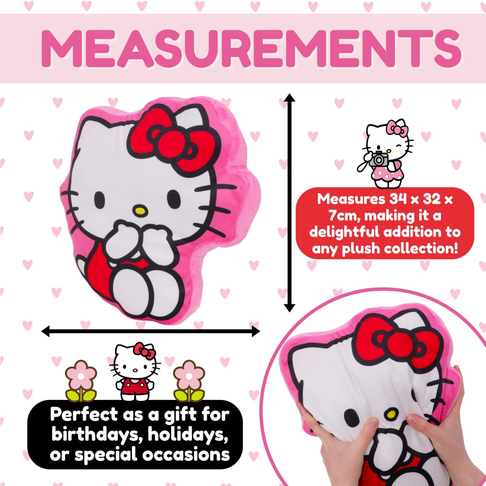 Measurements & Age: This Hello Kitty pillow measures 34 x 32 x 7cm and is suitable for ages 3+.