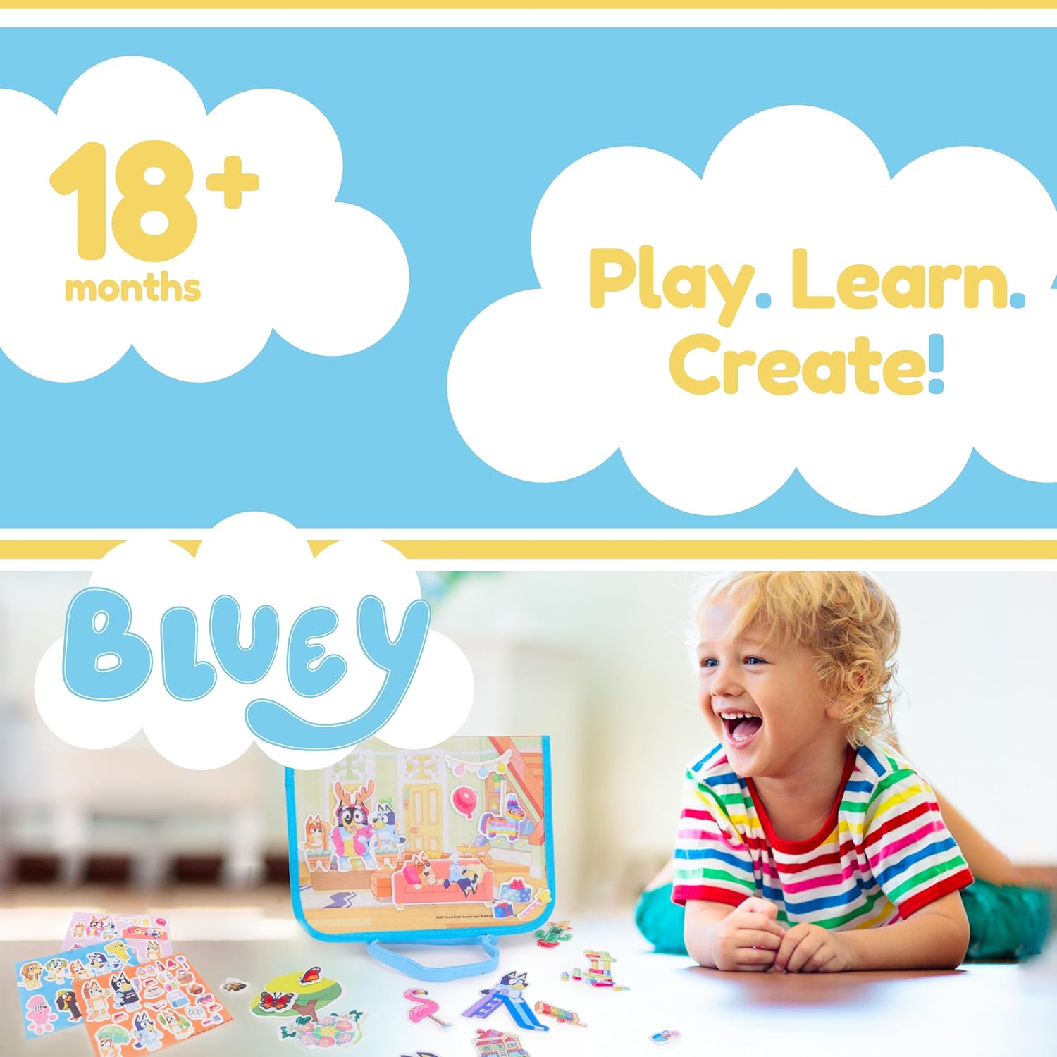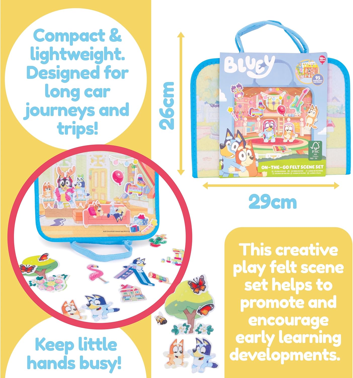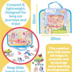 - Development: The Bluey felt scene set helps to promote and encourage early development, fine motor skills, creativity and imaginative play. With the large collection of characters, shapes and 2 scene backgrounds, your child will have hours of fun re-creating their favourite Bluey episodes.
