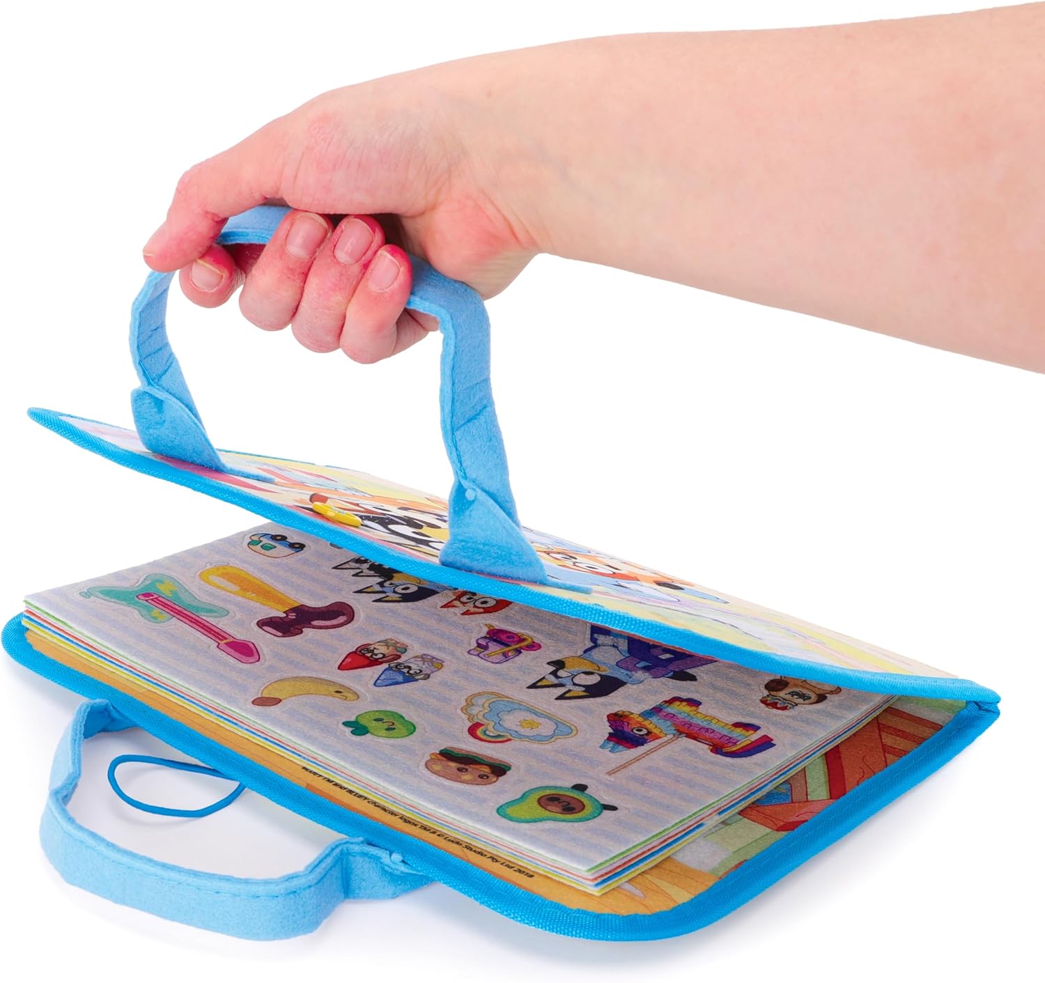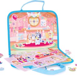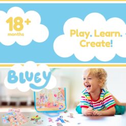 Re-create your favourite Bluey episodes and bring the characters to life with this fantastic 96 piece felt activity set. The set will keep your child entertained and engaged for hours whether at home or on the go. As the set comes complete with a portable carry case, it makes it the perfect travel toy. Made from a very lightweight felt and it’s slim and compact design measuring 29cm (12″) means all the components can be stored inside the carry case and is easy to pack and store away. The Bluey felt scene set helps to promote and encourage early development, fine motor skills, creativity and imaginative play. With the large collection of characters, shapes and 2 scene backgrounds, your child will have hours of fun re-creating their favourite Bluey episodes. Contents: 1 carry case with 2 different felt scenes inside and 6 felt sheets containing 95 characters and shapes to bring your sets and scenarios to life. Suitable for children over 18 months.