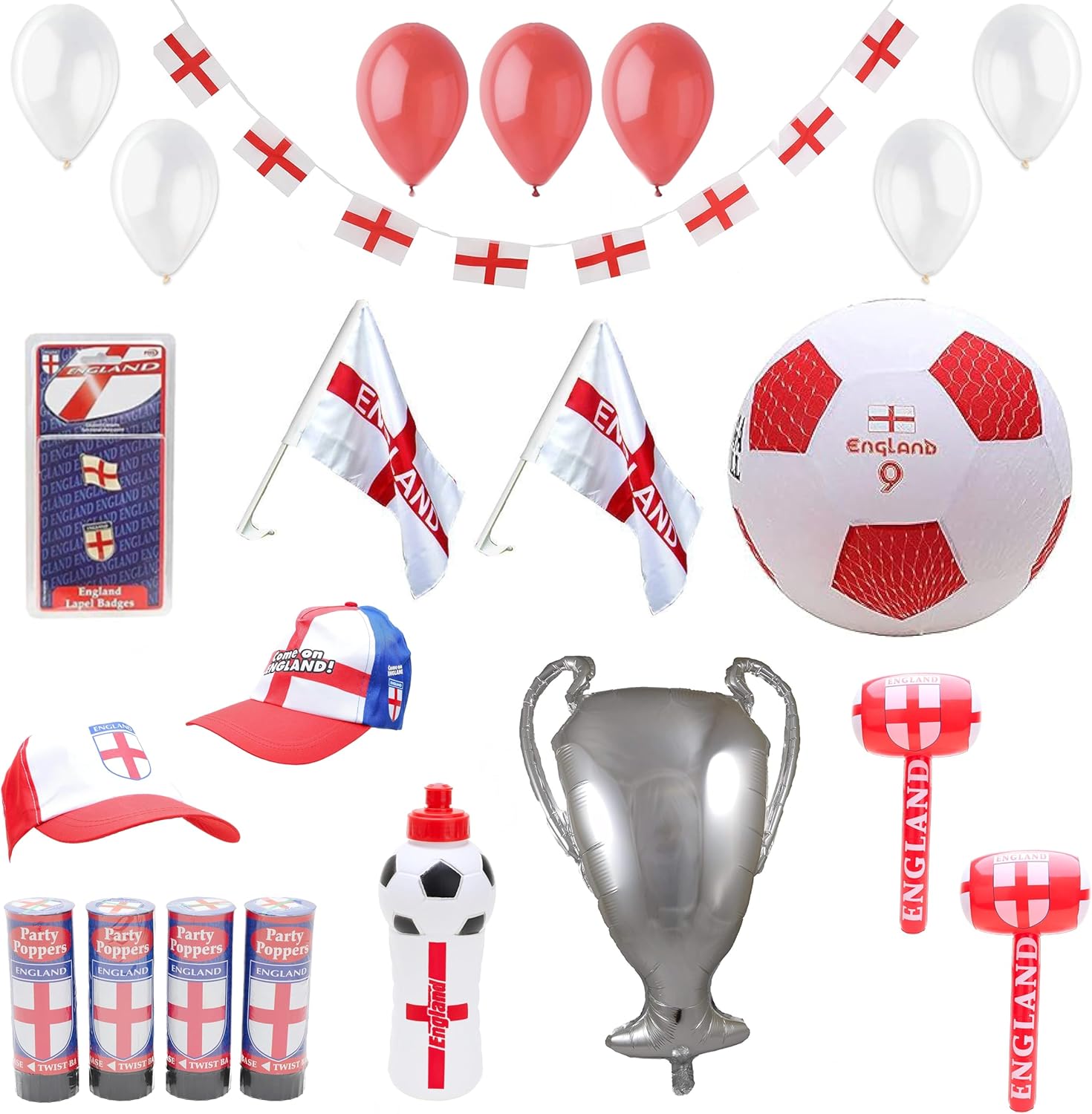 - This fantastic bundle consists of the following: 2 England Badges, 1 50cm Mega Ball, 2 Car Flags, 2 Inflatable Hammers, 1 Trophy Balloon, 4 Party Poppers, 1 Drinks Bottle, 2 England Caps, 1 3.6m England Bunting and 30 Red & White Latex balloons.