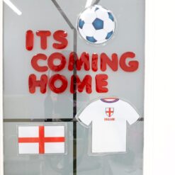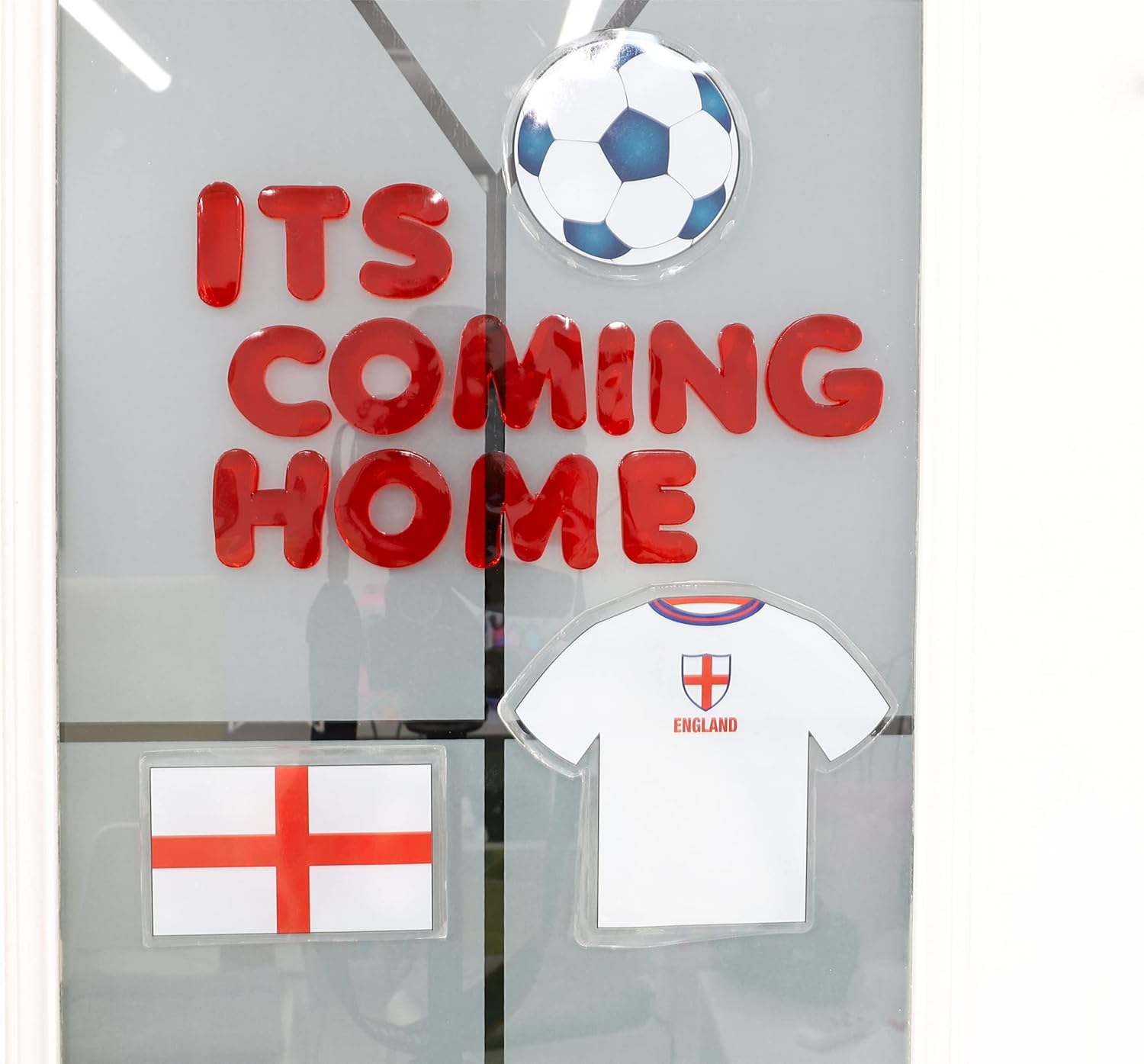 Show your support and back England at the world cup with these fantastic window stickers! You will receive a football, shirt, and letters spelling out “ITS COMING HOME”. They are made out of gel, meaning they will not leave unsightly marks on your windows when you take them down. They are reusable for future England celebrations. They can be used indoors in your home and in your car so you can show your support on the go! Each letter measures approximately 3.5cm, football 7.5cm and shirt 10.5cm.