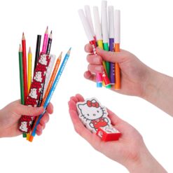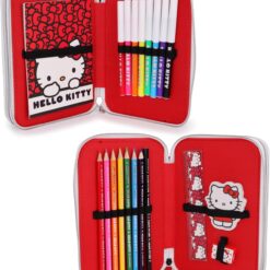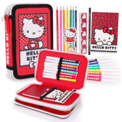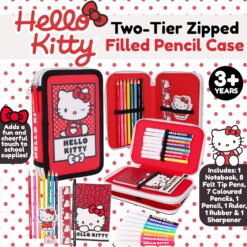 This fully stocked pencil case includes everything young artists and students need: 7 Crayons, 1 Pencil, 1 Ruler, 1 Rubber, 1 Sharpener, 1 Notebook, 8 Felt Tip Pens. The large-capacity two-tier design provides plenty of space to neatly store all the included stationery, keeping everything organised and easily accessible for school, homework, or creative activities.Featuring the beloved Hello Kitty character, this pencil case adds a fun and cheerful touch to school supplies. The bright red background with playful polka dots and bold Hello Kitty artwork on the front makes it stylish and perfect for fans of the iconic character. The charming heart-shaped zip pull adds a cute finishing touch to the pencil case while making it easier for little hands to open and close the compartments smoothly. Crafted from durable polyester, the pencil case is lightweight yet strong, helping it withstand everyday school use while keeping the contents protected and easy to clean. This pencil case measures 20cm (8“) and is suitable for ages 3+.
