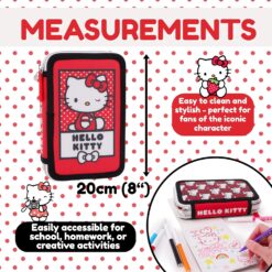 - Cute & Colourful Hello Kitty Design: Featuring the beloved Hello Kitty character, this pencil case adds a fun and cheerful touch to school supplies. The bright red background with playful polka dots and bold Hello Kitty artwork on the front makes it stylish and perfect for fans of the iconic character.