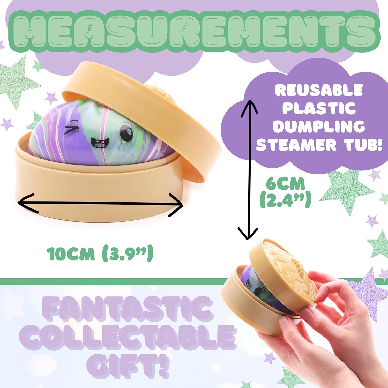 - The bao dumpling measures approximately 8cm (3.1″) in length, and 10cm (3.9″) when packaged inside the reusable plastic steamer box. Perfect for gifting, collecting, party bags, or everyday fidget fun. Suitable for ages 3+.