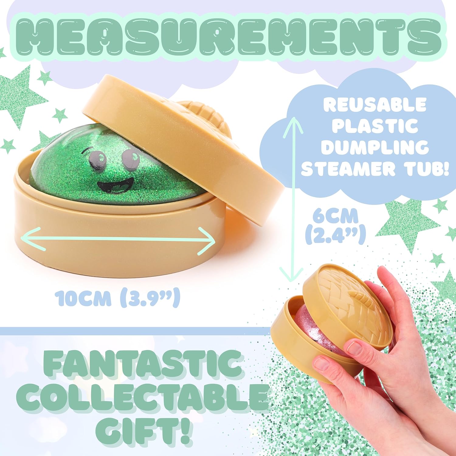- The bao dumpling measures approximately 8cm (3.1″) in length, and 10cm (3.9″) when packaged inside the reusable plastic steamer box. Perfect for gifting, collecting, party bags, or everyday fidget fun. Suitable for ages 3+.